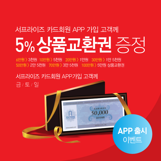 - 대상 : 서프라이즈 카드 APP가입 고객 6/10/20/30/40/50/70/100만원 구매고객