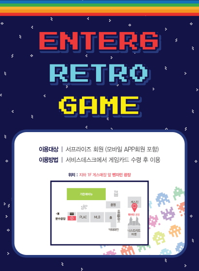 레트로 오락실의 게임기는 모바일 앱 회원을 포함한 엔터식스 서프라이즈 회원이라면 누구나 무료로 이용할 수 있다. 서비스데스크에서 회원 인증 후, 회원에게만 주어지는 충전형 게임 카드를 사용하면 된다.