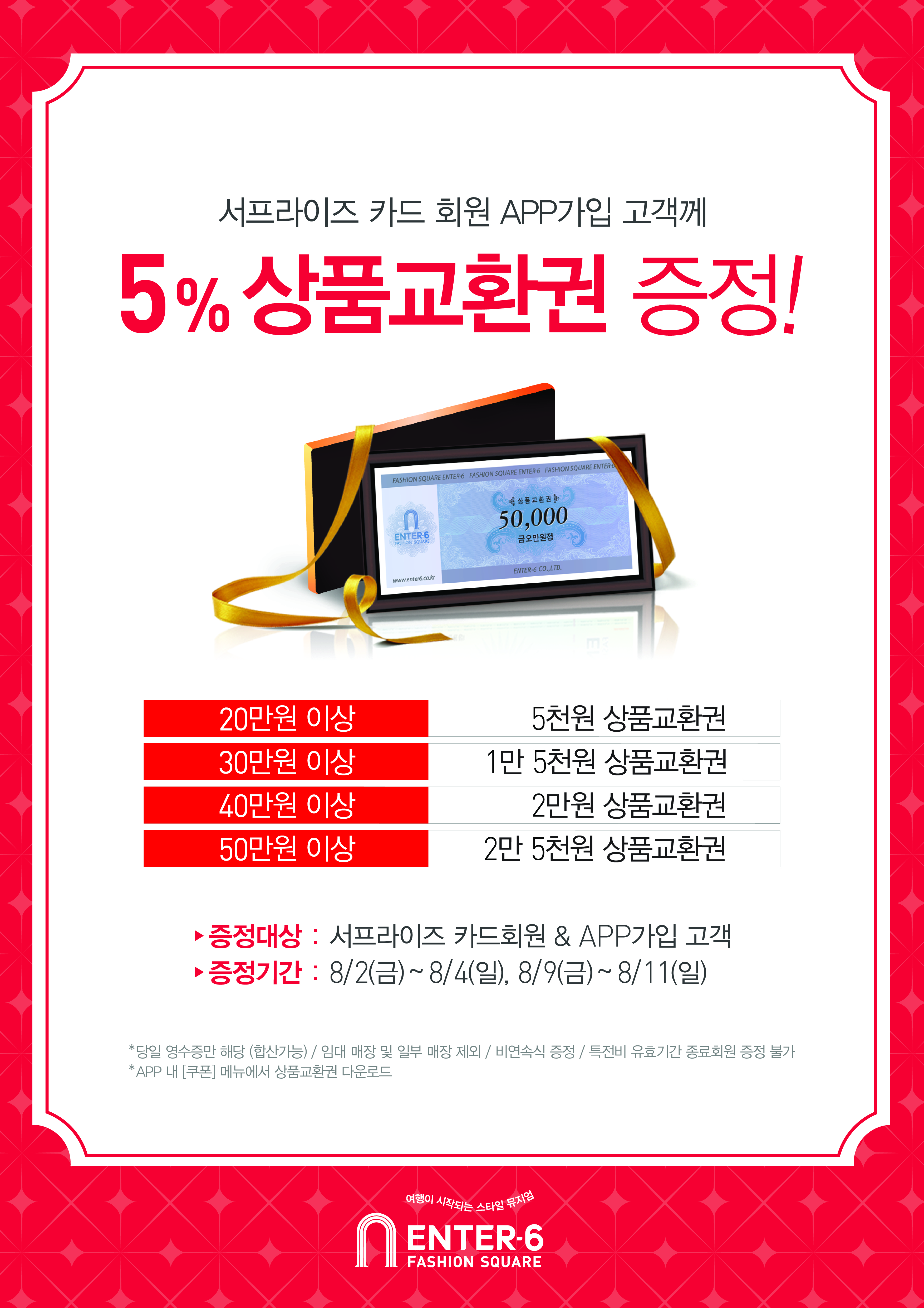 - 대상: 엔터식스 서프라이즈 회원 10만원 이상 구매 고객