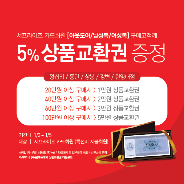- 대상 : 서프라이즈 카드회원 [아웃도어/남성복/여성복] 브랜드 20/40/60/100만원 이상 구매 고객