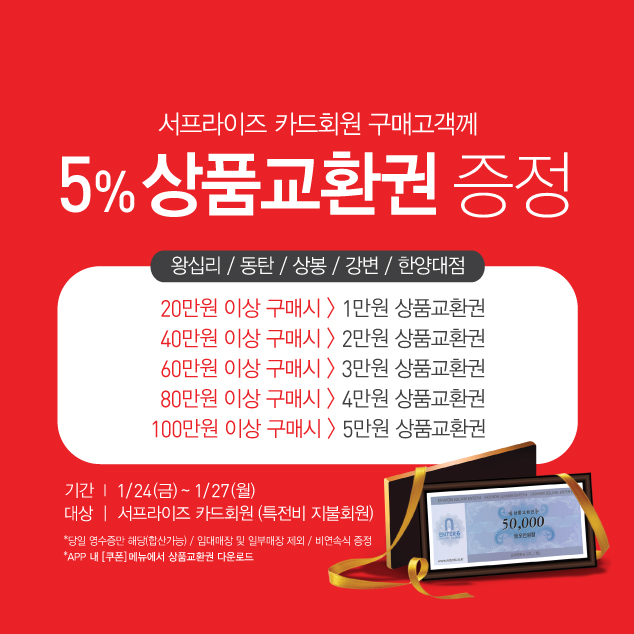 * 서프라이즈카드 회원 5% 상품교환권 증정 (왕십리/동탄/상봉/강변/한양대)
