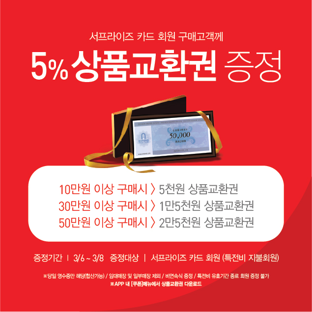 - 대상 : 서프라이즈 카드회원 10/30/50만원 이상 구매 고객
