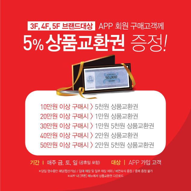 - 대상 : APP회원 10/20/30/40/50만원 이상 구매 고객