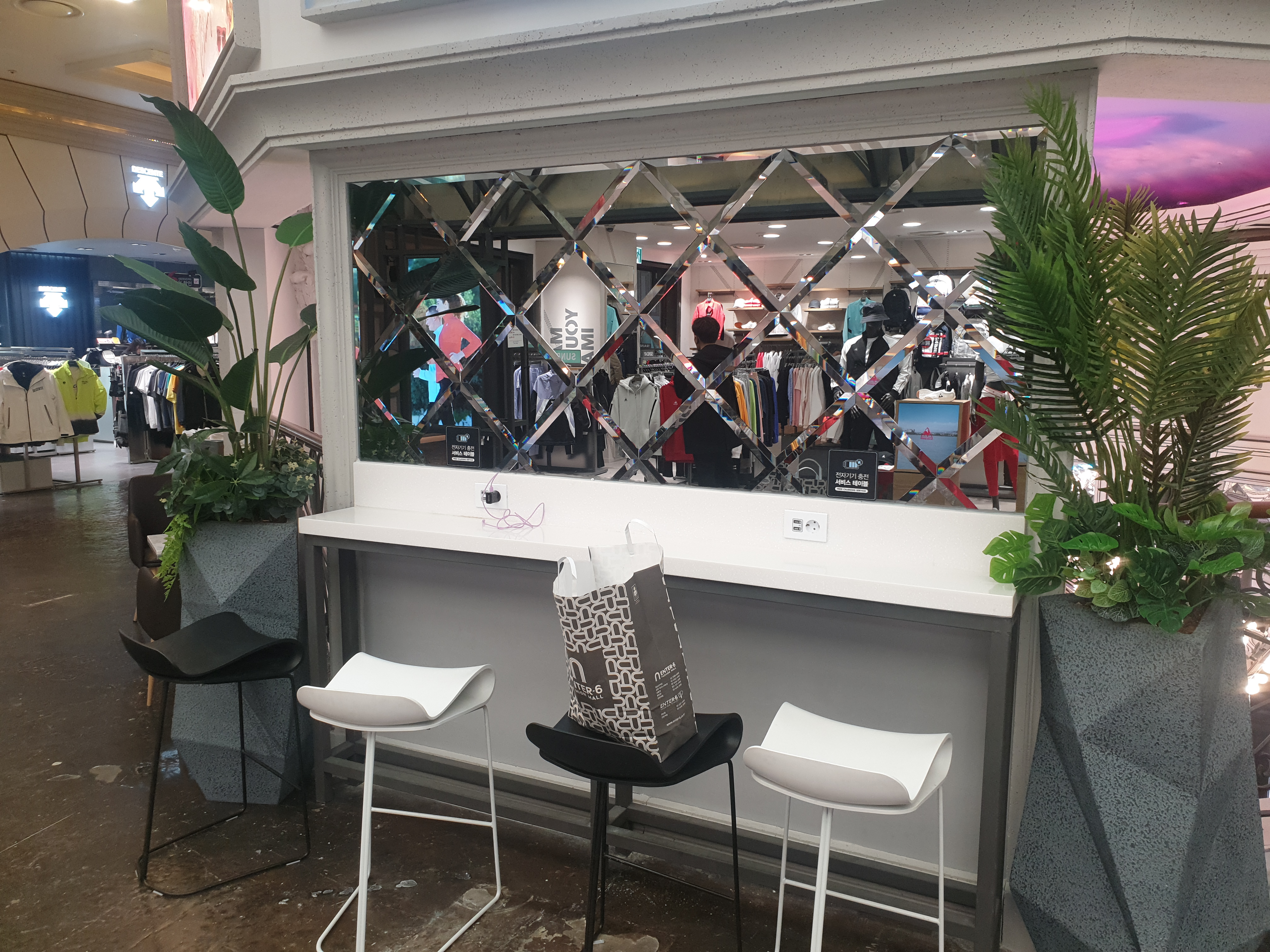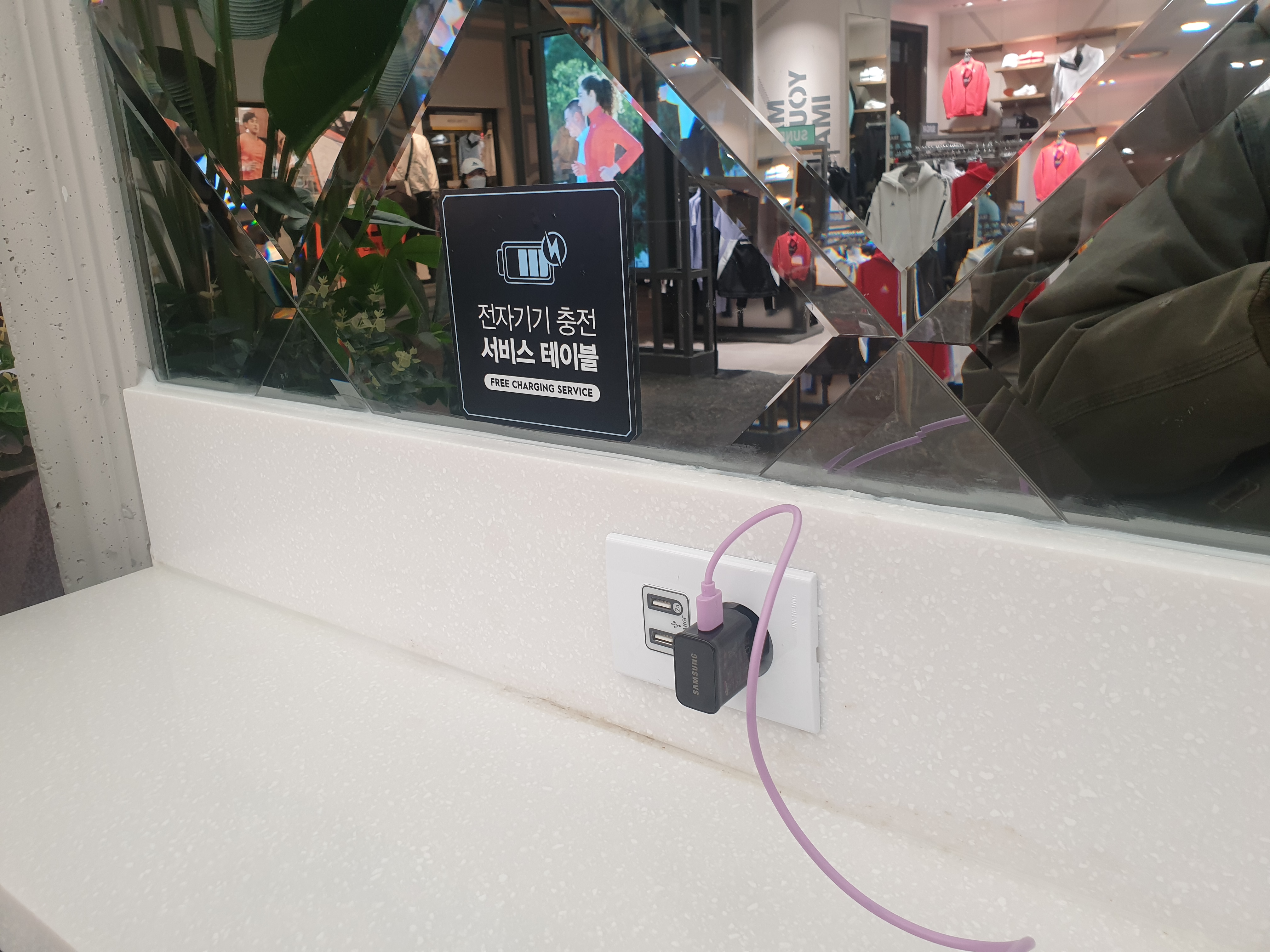 전자기기 충전하는 곳이 생겼다는 것…..!! 끼야호! 마침 배터리도 없어서 충전도 하고…^^ (쇼핑한 쇼핑백도 자랑하고~~ㅎㅎ) 나중에 여기는 자리가 없어서 차지 못할 곳이 되지 않을까요….ㅎㅎㅎㅎ 이런 공간을 새로 만들어줘서 너무 좋았어요 ㅠㅠㅠ 그리고 앉아서 쉴 수 있는 공간도 더 만들어줘서 짱짱!