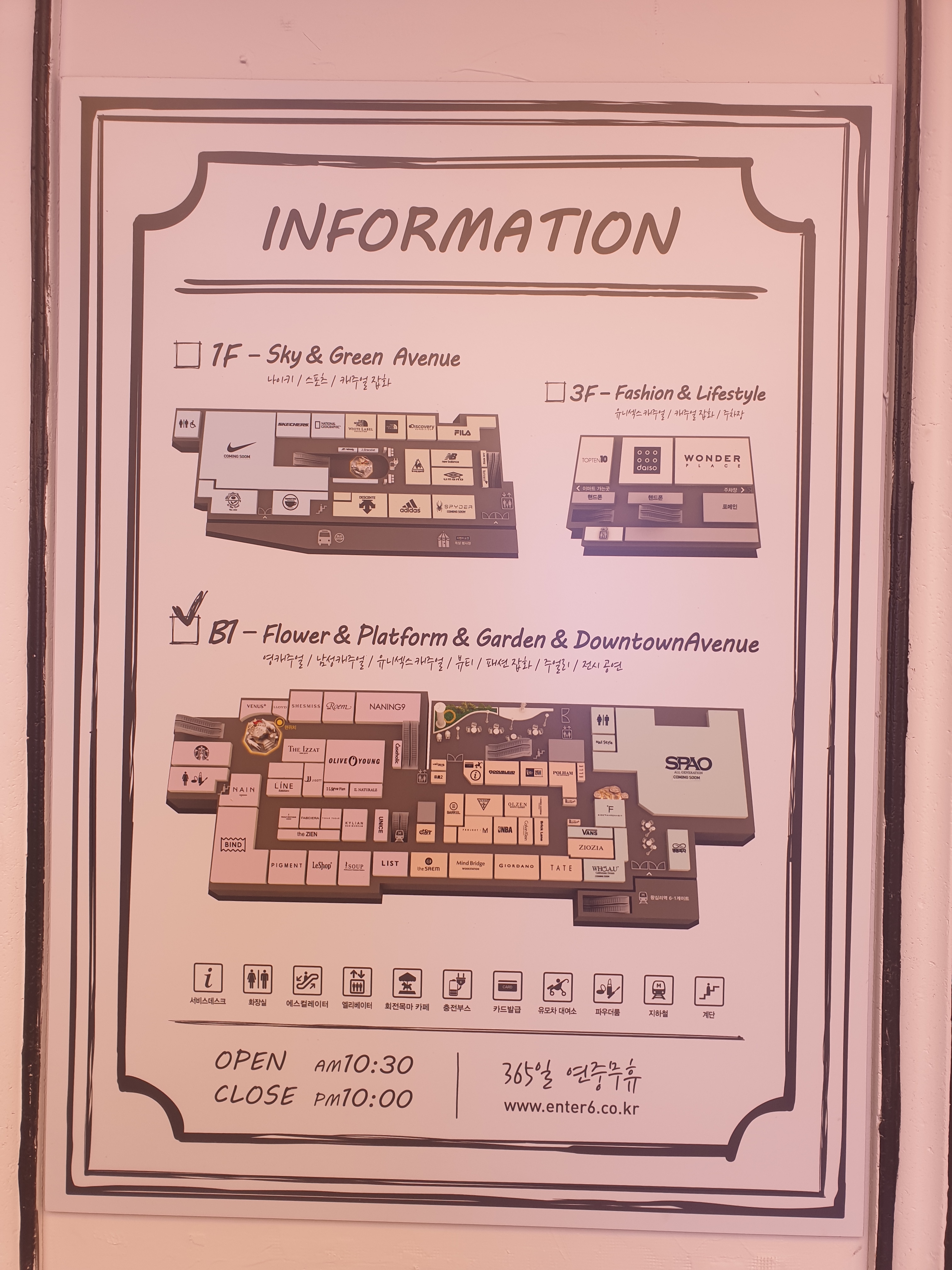 리뉴얼된 매장안내도입니다! 여기엔 일시적으로 변경된 영업시간은 없는데 꼭 잊지 말고 코로나19가 잠잠해지기 전까진 오전 11시부터 오후 9시30분인 것 잊지 마시구요^^ 자세한 매장 안내도는 홈페이지나 APP에 정확하게 나와있어서 참고하시면 될 것 같아요~