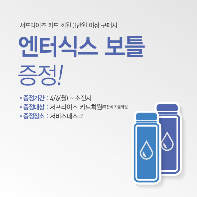 - 대상 : 서프라이즈 카드회원 3만원 이상 구매 고객
