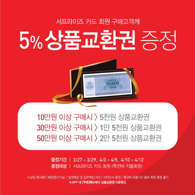 - 대상 : 서프라이즈 카드회원 10/30/50만원 이상 구매 고객