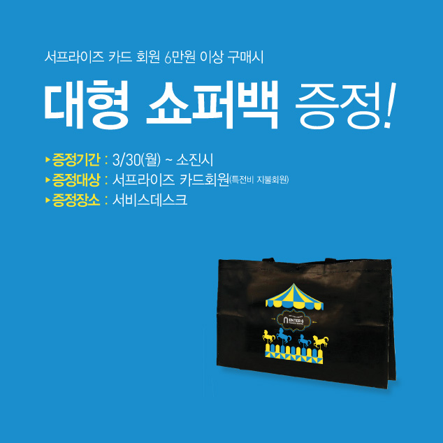 - 대상 : 서프라이즈 카드회원 6만원 이상 구매 고객