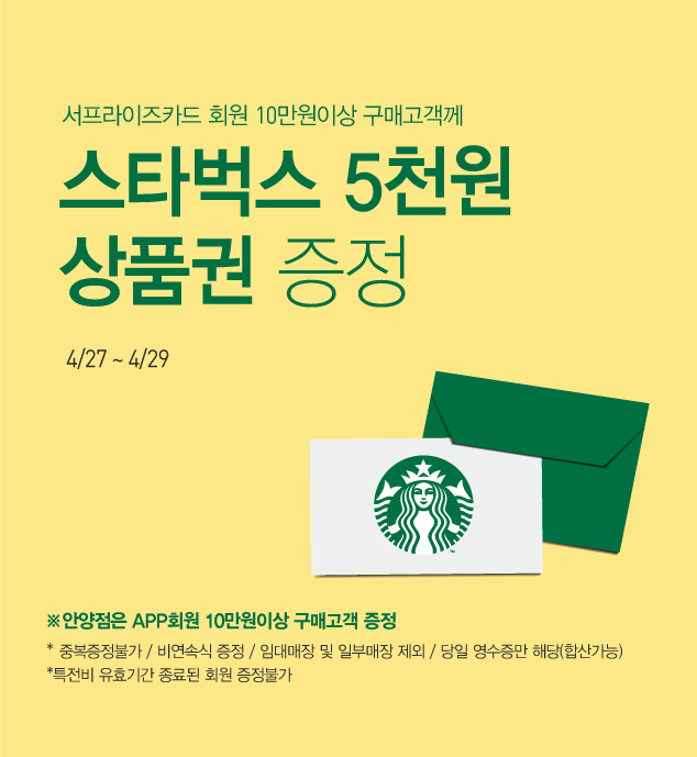 - 대상 : 서프라이즈 카드회원 10만원 이상 구매 고객