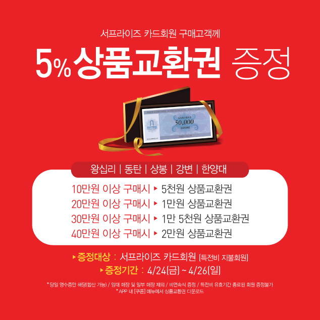 - 대상 : 서프라이즈 카드회원 10/20/30/40만원 이상 구매 고객