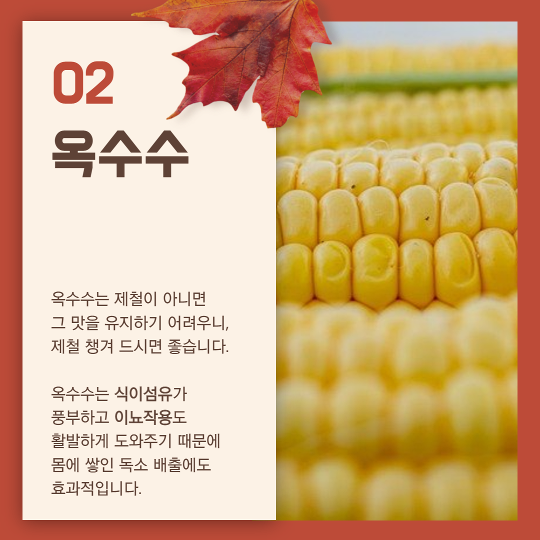 옥수수는 식이섬유가 풍부하고 이뇨작용도 활발하게 도와주기 때문에