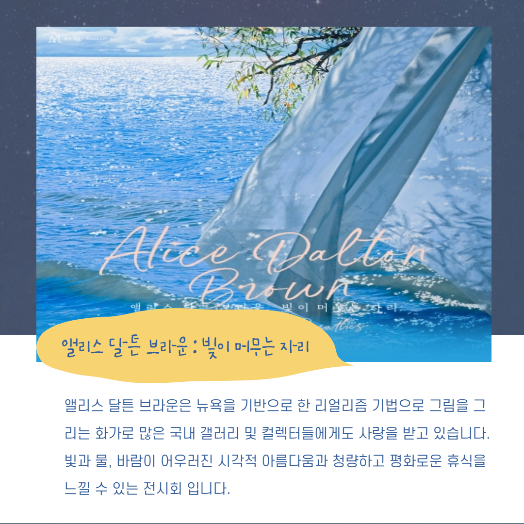 빛과 물, 바람이 어우러진 시각적 아름다움과 청량하고 평화로운 휴식을 느낄 수 있는 전시회 입니다.