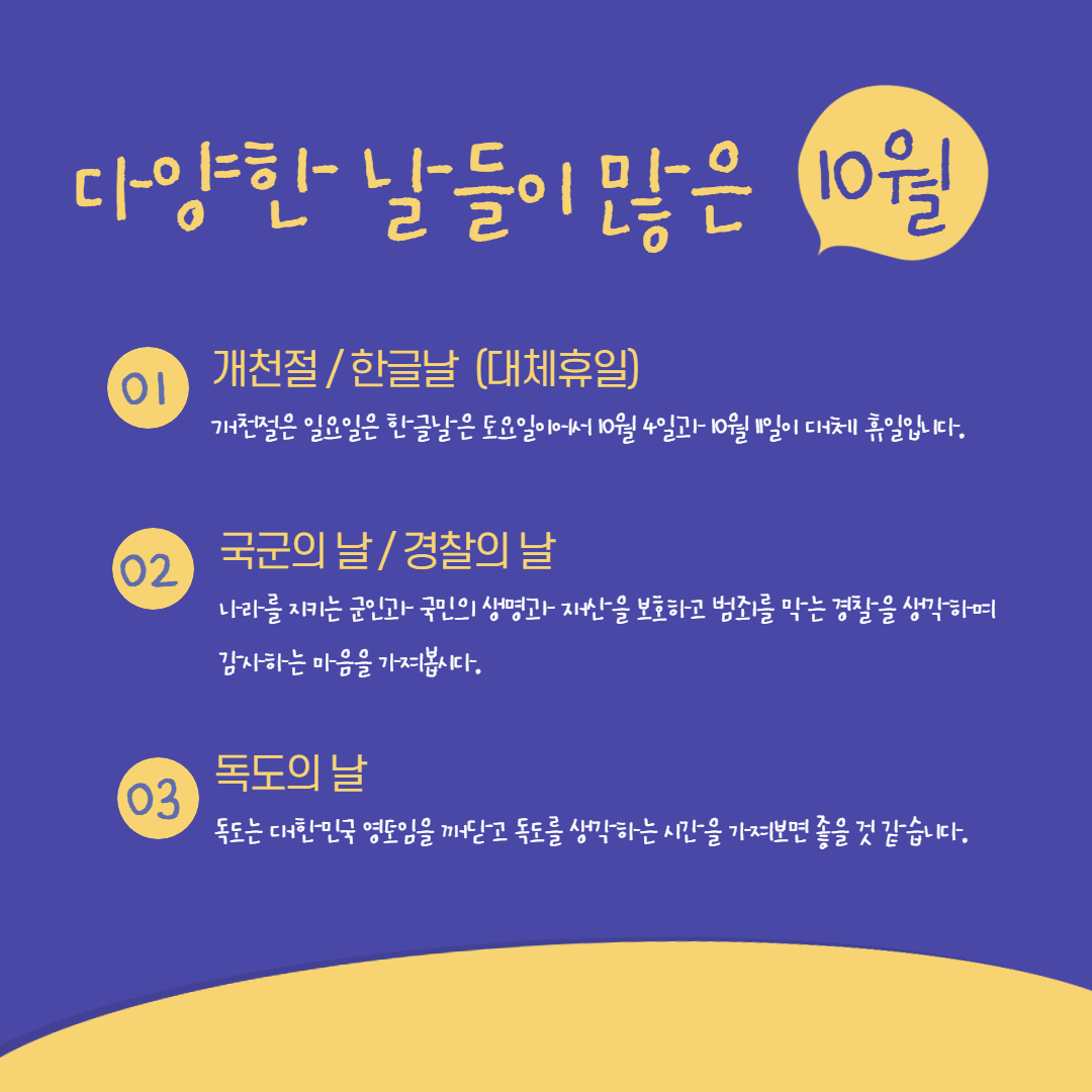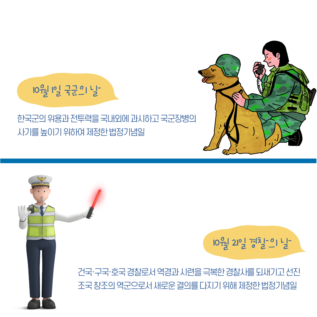 또한 10월에는 국군의 날과 경찰의 날이 있는데요. 나라를 지키는 군인과 국민의 생명과 재산을 보호하고 범죄를 막는 경찰에 대해서 감사하는 시간을 가져보는 것도 좋을 것 같습니다.