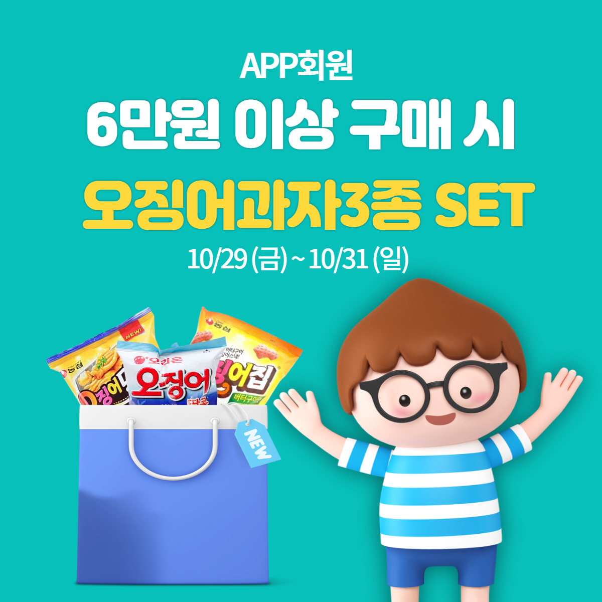 6만원 이상 구매 시 오징어과자 3종 SET를 받을 수 있고