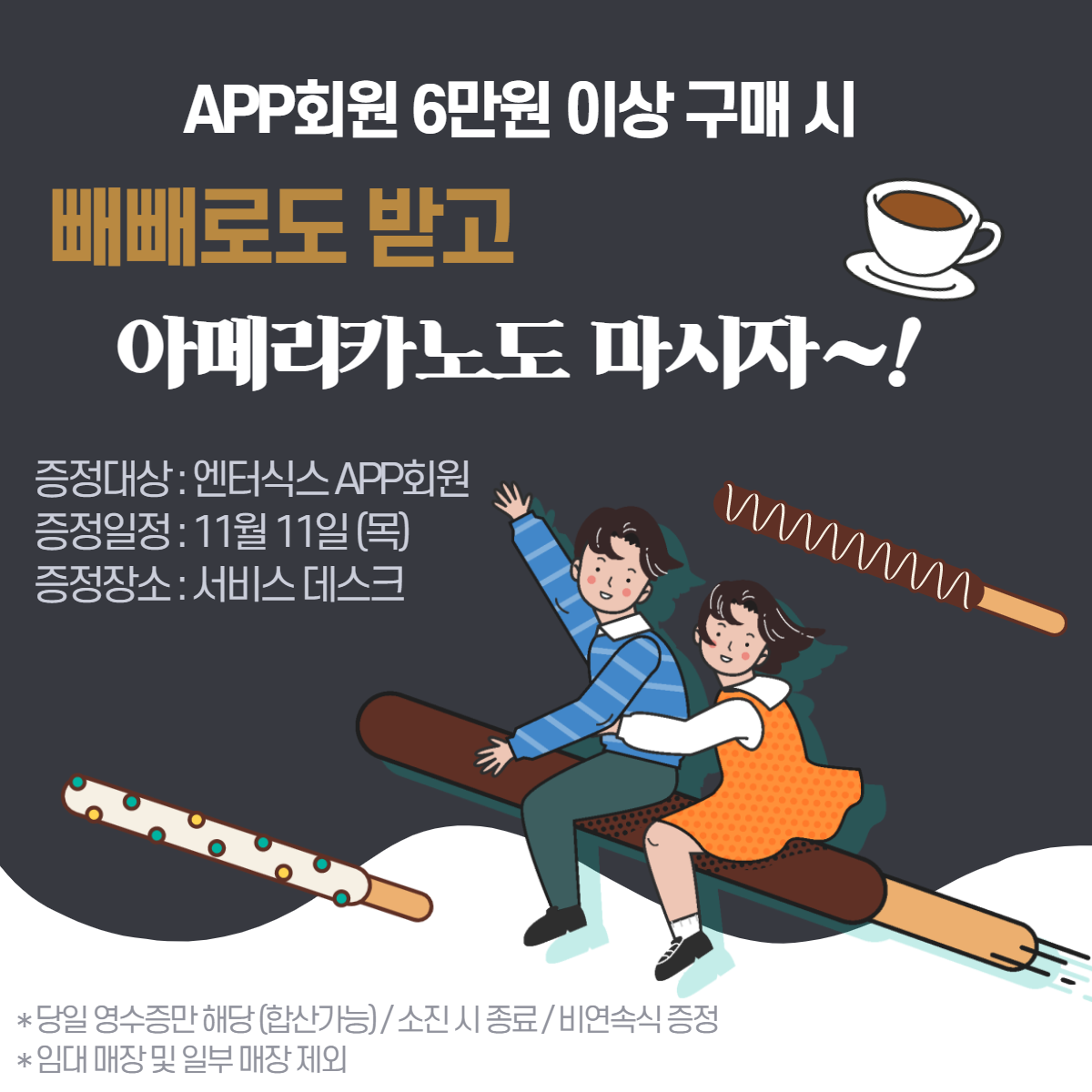 엔터식스 APP회원이라면 6만원 이상 구매 시 #빼빼로 도 받고 #아메리카노 쿠폰 까지 받을 수 있습니다.