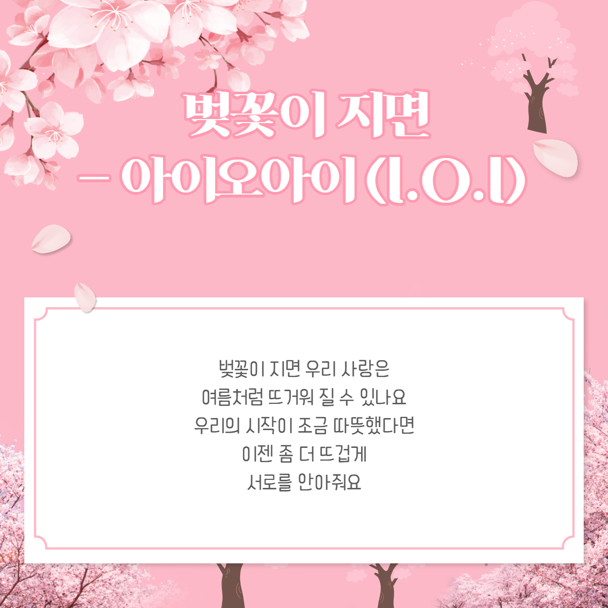 이곡은 프로젝트 그룹 #아이오아이 #벚꽃이지면 이라는 곡입니다.