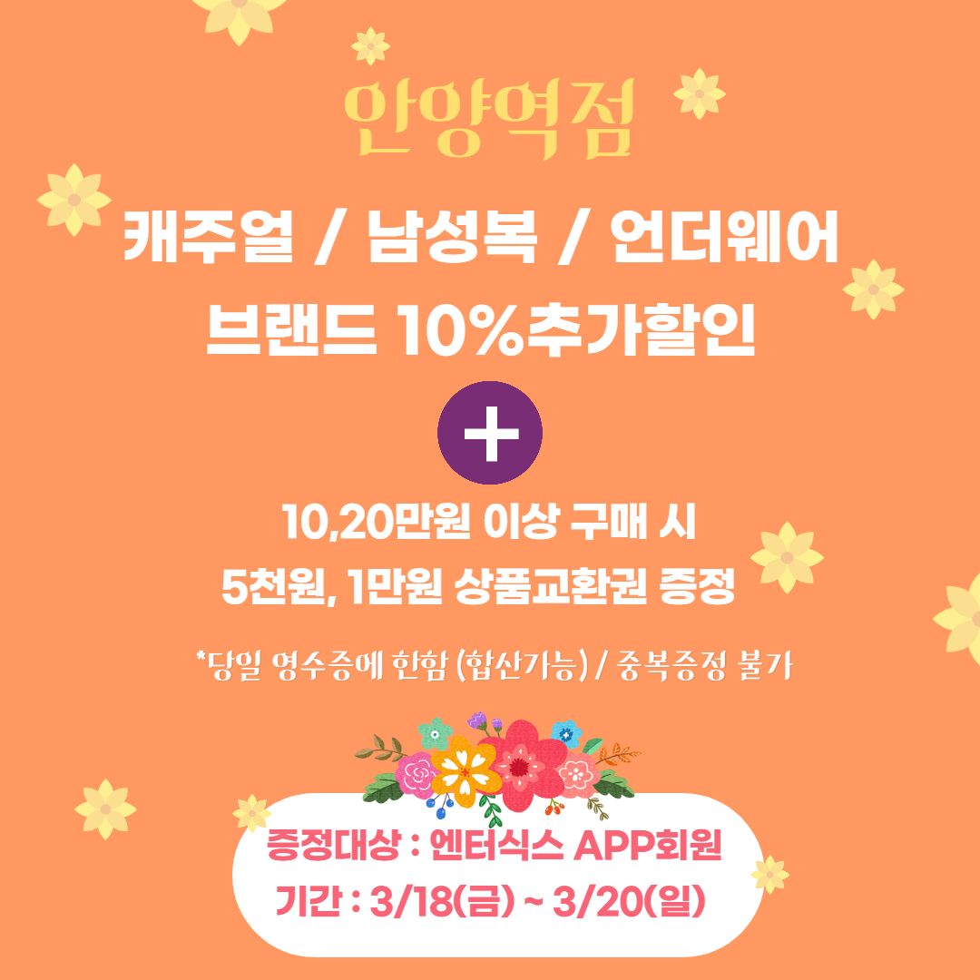 캐주얼 / 남성복 / 언더웨어 브랜드 10% 할인에