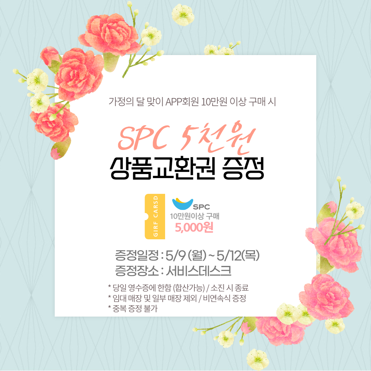 10만원 이상 구매고객엑에 SPC 5천원 상품교환권을 증정합니다.