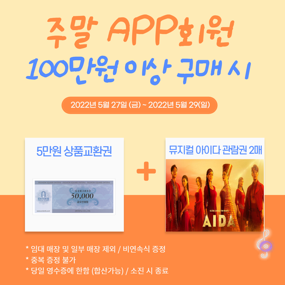 100만원 이상 구매 시 5만원 상품교환권 + 뮤지컬 #아이다 관람권 2매를 드립니다.