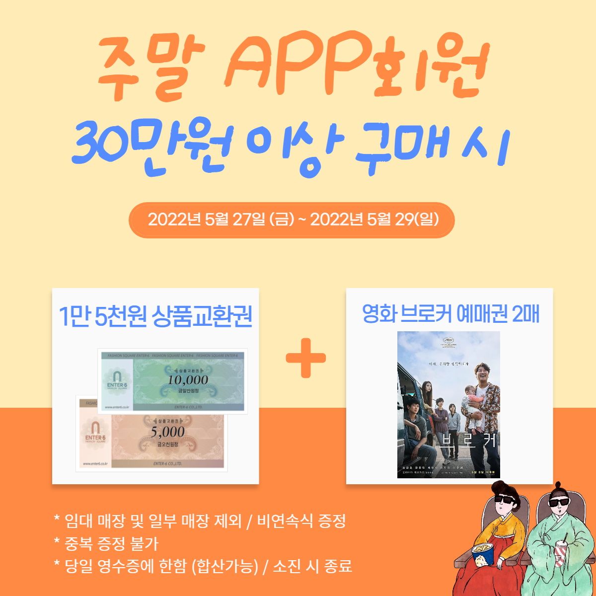 30만원 이상 구매 시 엔터식스 1만 5천원 상품교환권 + 영화 #브로커 예매권 2매를 드립니다.