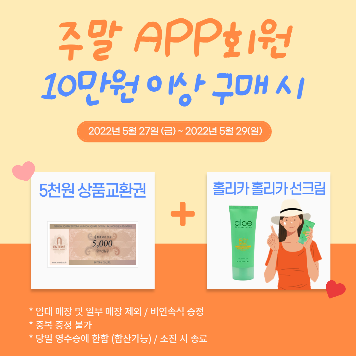 10만원 이상 구매 시 엔터식스 5천원 상품교환권 + #홀리카홀리카 선크림을 드립니다.