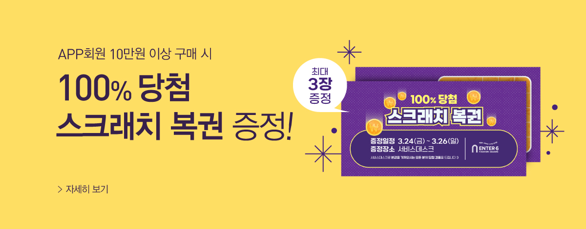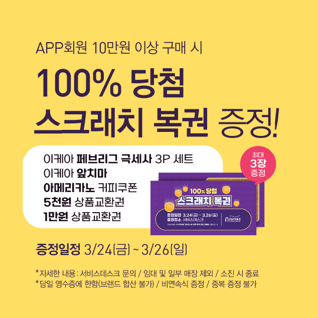 카테고리 없음 [APP회원 10만원 이상 구매 시] 100% 당첨 스크래치 복권 증정 n실장 2023. 3. 24. 13:25 728x90 공유하기 게시글 관리 Enter-6 Style Magazine