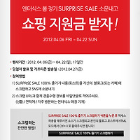 [봄 정기세일 이벤트] 엔터식스 SURPRISE SALE 소문내고 쇼핑 지원금 받자! (1055) | 2012.03.30 |