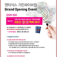 [Event] 엔터식스 가든파이브점 오픈 기념 퀴즈&스크랩 이벤트 당첨자 발표! (9) | 2012.03.29 |