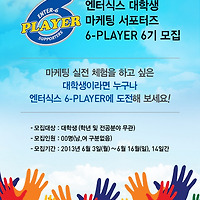 엔터식스, 대학생 서포터즈 식스 플레이어(6-PLAYER) 6기 모집 (0) | 2013.06.03 |