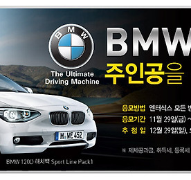2013년 11월 29일 엔터식스 상봉점 오픈 기념 빅 이벤트! ‘BMW의 주인공을 찾습니다!’ 응모대상 : 엔터식스 모든 방문 고객 응모기간 : 11월 29일(금) ~ 12월 28일(토) 당첨발표 : 12월 29일(일) 오후 2시 공식 홈페이지 고지 BMW 120d 스포츠 라인 ? 레이아웃 : 앞 엔진, 뒷바퀴 굴림, 5도어, 5인승 해치백 엔진, 기어 : 직렬 4기통 2.0ℓ 디젤 터보 엔진, 184마력/38.8kg·m, 8단 자동 길이×너비×높이-4324×1765×1421mm 서스펜션 앞/뒤 : 스트럿/멀티링크 타이어 앞, 뒤 : 225/40R18, 245/35R18 연비(도심, 고속도로, 복합), 가격 : 16.7, 21.4, 18.5km/ℓ, 4680만원 자신이 이 차의 주인이라 생각하시는 분들..