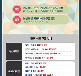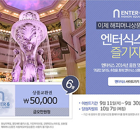 Now Event 썸네일형 리스트형 엔터식스 상품교환권 100% 증정 이벤트! 매장에 오시면 무조건, 선착순 1000명!!! 엔터식스 상품교환권 100% 증정 이벤트! 매장에 오시면 무조건, 선착순 1000명!!! 엔터식스와 SK플래닛의 시럽이 함께하는 스마트 알림 서비스! 매장에 들어서는 순간 당신의 핸드폰으로 쿠폰이 쏟아 진다! 11월 17일부터 30일까지, 엔터식스 근처에서 블루투스만 켜주세요! 블루투스를 켜는 순간, 엔터식스 5000원 상품교환권은 물론 브랜드 별 할인 쿠폰이 당신의 핸드폰 속으로 쏘옥! 공짜로 쿠폰 받기! 이것만 따라해보세요! step 1. 구글 및 애플 스토어에서 시럽(syrup) 어플리케이션을 다운 받고 엔터식스 모바일 멤버십에 가입한다! step 2. 블루투스를 켜고 엔터식스를 방문한다! step 3. 핸드폰으로 상품교환권 5000원과 브랜드 별 할인 쿠폰이 도착하면 알뜰하게 쇼핑한다! 각 점별 .. 더보기 Park Avenue 엔터식스 한양대점 Grand Open! 2014.12.19 더보기 엔터식스 인스타그램 카카오스토리 오픈 이벤트! 스타벅스, 던킨 등 푸짐한 선물이! 엔터식스 인스타그램 카카오스토리 오픈 이벤트! 스타벅스, 던킨 등 푸짐한 선물을 받고 싶으시다면 > 더보기 빼빼로데이, 솔로라도 괜찮아~! 2014.10.20~11.02 빼빼로데이, 솔로라도 괜찮아~! 2014.10.20~11.02 엔터식스 홈페이지 신규 가입 회원 100% 증정 이벤트! '솔로라도 괜찮아!' 2014.10.20~11.02 기간 내 엔터식스 홈페이지에 가입하고 솔로 혹은 커플의 좋은 점을 댓글로 남겨 주세요! 가입 후 댓글을 남겨주신 500명의 신규 회원 분들 모두에게(선착순) 빼빼로를 드립니다^^ 더보기 엔터식스에서 쇼핑지원금 쏩니다!!! 갖고 싶은 아이템을 올려주세요^^ 엔터식스에서 쇼핑지원금 쏩니다!!! 갖고 싶은 아이템을 올려주세요^^ 평소 갖고 싶었던 아이템을 사진으로 올려보세요! 엔터식스가 갖고 싶은 물건을 마음껏 살 수 있는 쇼핑지원금을 쏩니다!!! 참여하러 가기 더보기 엔터식스와 해피머니의 만남! 응원 댓글만 달아도 상품교환권을 드려요! 엔터식스와 해피머니의 만남! 응원 댓글만 달아도 상품교환권을 드려요! (참여를 원하시면 클릭) 해피머니 상품권으로 엔터식스를 즐기자! 엔터식스 2014년 응원 댓글을 달아주시면 추첨을 통해 엔터식스 상품교환권을 드립니다^^ 이벤트 기간 : 2014.09.11~2014.09.30 당첨자 발표 : 2014.10.07 (참여를 원하시면 클릭) 더보기 파파라치 스냅 댓글 신청 이벤트 2014.09.11~2014.09.25 파파라치 스냅 댓글 신청 이벤트 2014.09.11~2014.09.25 파파라치 스냅을 찍어 드립니다! (참여를 원하시면 클릭!) ▶ 이벤트 일자 : 9.11 (목) ~ 9.25 (목) 당첨자 발표 : 9.30 (화) ▶ 이벤트 참여 방법 엔터식스 홈페이지에 댓글로 사연과 촬영을 희망하는 엔터식스 지점명 남기기 ▶ 이벤트 경품 추첨을 통해 총 4분께 스냅촬영 전문 업체 “스냅퍼”의 파파라치 스냅 무료 촬영권 (35만원 상당) 증정 ▶ 상품구성 ㆍ스냅촬영 1시간~1시간30분 ㆍ원본/보정본 DVD 제공 ㆍ감성리터칭 보정 50컷 ㆍ4X6인치 사진인화 50컷 ㆍ소형액자 1개 ㆍ중대형 11X14인치 ㆍ사진인화 1컷 ▶ 촬영컨셉 : 데이트/가족 스냅 ▶ 주의사항 1) 촬영일정은 신청일 기준으로 협의 후 진행됩니다... 더보기 호로록 개그우먼 이국주 팬사인회! 엔터식스에서 진행됩니다! 호로록호로록~개그우먼 이국주 팬사인회! 엔터식스에서 진행됩니다! 왼손으로 비비고 오른손으로 비비면 두그릇이네~헤~~~~♬ 짜라짜라짜 짜짜짜 짜~~~~~아게 먹기! 일요일은 짜게 먹는날! 호로록~!! 재밌고 유쾌한 식탐송의 주인공! 대세 개그우먼 이국주씨가 엔터식스에서 팬사인회를 갖습니다. 이국주씨의 팬사인회는 9월 14일 일요일! 엔터식스 왕십리점과 상봉점 두곳에서 진행되는데요! 엔터식스 상봉점 오후 2시, 엔터식스 왕십리점 오후 4시에 릴레이로 펼쳐진답니다. 일시 : 09.14 일요일 PM 02:00~03:00 장소 : 3층 행사장 일시 : 09.14 일요일 PM 04:00~05:00 장소 : B1 가든에비뉴 대세 개그우먼 이국주와 패션몰 엔터식스와의 만남! 9월 14일 일요일, 엔터식스에서 만나요~^0^ 더보기 이전 1 ··· 15 16 17 18 19 20 21 ··· 34 다음