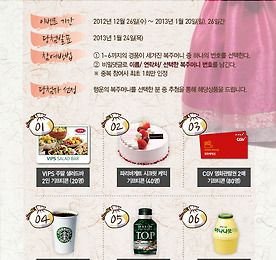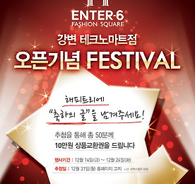 Now Event 썸네일형 리스트형 [이벤트]엔터식스 강변 테크노마트점 오픈소식 소문내기(당첨자발표) 더보기 2013 새해맞이 행운의 福 주머니를 맞춰라!! 더보기 [엔터식스 전 점 이벤트] 해피트리에 축하의 글을 남겨주세요! 더보기 [엔터식스 전 점 이벤트] 엔터식스에서 쇼핑하고 홍콩여행가자! 더보기 [엔터식스 강변 테크노마트점 오픈 이벤트] 벤츠의 주인공을 찾습니다 !! 2012년 12월 14일 엔터식스 강변테크노마트점 오픈 기념 빅 이벤트! ‘벤츠의 주인공을 찾습니다!’ 응모대상 : 엔터식스 강변 테크노마트점 모든 방문 고객 응모기간 : 12월 14일(금) ~ 12월 25일(화) 응모장소 : 1층 행사장 당첨발표 : 12월 29일(토) 오후 2시 (추첨 당일 추첨 현장 참여 고객에 한해 당첨자 인정, 미참석시 재추첨) 국내 한정으로 판매 되는 벤츠 스마트 포투(smart for two) 스페셜 에디션의 주인공을 찾습니다. 자신이 주인이라 생각하시는 분들은 엔터식스 강변 테크노마트점으로 와주시기 바랍니다! 벤츠 스마트 포투 스페셜 에디션? 엔터식스 강변 테크노마트점 오픈 축하 이벤트 경품인 '벤츠 스마트 포투(smart for two) 스페셜 에디션'은 국내에서만 한정으.. 더보기 [엔터식스 강변 테크노마트점 오픈 기념 이벤트] 상품교환권 5만원 쏜다!! 엔터식스가 소셜커머스 위메프(위메이크프라이스)와 손잡고 총 60분께 상품교환권 5만원을쏩니다!!! 12월 14일 엔터식스 강변테크노마트점 오픈을 축하하며 진행되는 이 이벤트는 2012.12.09(일) ~12.17(월)까지 응모 가능하며 12월 18일(화)에 행운의 당첨자가 발표될 예정이랍니다! 응모방법은 간단해요! ▼응모방법▼ 위메프에서 해당 이벤트의 응모하기 버튼 클릭 후 결제하기 버튼을 누르면 참여 완료! 참 쉽죠잉~? 빠르게 빠르게 응모하시고 5만원권의 주인공이 되어보세요! 보다 더 자세한 내용을 알고싶으시다면 아래 내용을 참고 해주세요^^ 더보기 서프라이즈 카드로 즐기는 문화생활 더보기 이제 엔터식스 상품교환권이 주유소에서도 사용가능합니다! 더보기 이전 1 ··· 20 21 22 23 24 25 26 ··· 34 다음