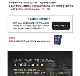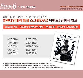 Now Event 썸네일형 리스트형 [엔터식스 가든파이브점 오픈 기념] 100% 당첨 퀴즈&스크랩 이벤트 (3.16 FRI-3.22 THU) function goScrap2(){ //가격현재scrapText = blog500.innerHTML;window.clipboardData.setData('Text', scrapText);alert("포스트가 복사 되었습니다.\n\n 블로그, 게시판에 HTML 상태에서 CTRL+V 을 누르셔서 붙여넣기 해주세요");} 더보기 [엔터식스 왕십리점] 2012 SPRING FLOWER FESTIVAL (3.9 FRI-3.22 THU) 더보기 [엔터식스 코엑스점] 2012 SPRING FLOWER FESTIVAL (3.9 FRI-3.22 THU) 더보기 [엔터식스 동탄메타폴리스점] 2012 SPRING FLOWER FESTIVAL (3.9 FRI-3.22 THU) 더보기 엔터식스 로고 디자인 공모전 더보기 퀴즈도 풀고~ 뮤지컬도 보고! 총 40명에게 "캐치 미 이프 유캔" 티켓을 드립니다! 더보기 [FACEBOOK] 엔터식스 페이스북 '좋아요'를 누르면 선착순 1,000명에게 기프티콘을 쏩니다! 더보기 [Event] 발렌타인데이 데이트코스 스크랩&댓글 이벤트 당첨자 발표 더보기 이전 1 ··· 28 29 30 31 32 33 34 다음