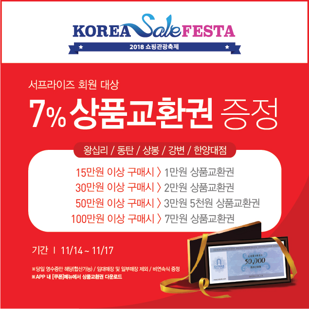 - 대상 : 서프라이즈 카드회원 15/30/50/100만원 이상 구매 고객