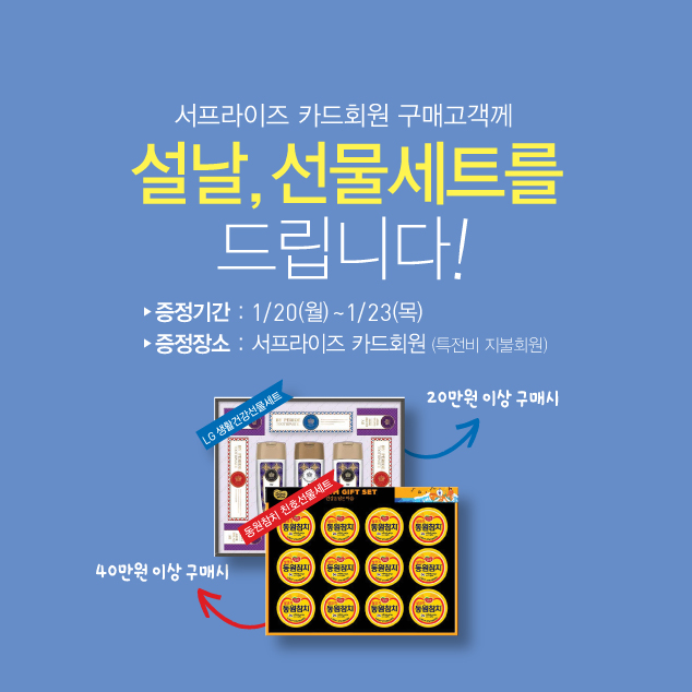 - 대상 : 서프라이즈 카드회원 20/40/60/80/100만원 이상 구매 고객