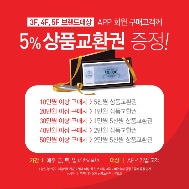 - 대상 : APP회원 10/20/30/40/50만원 이상 구매 고객