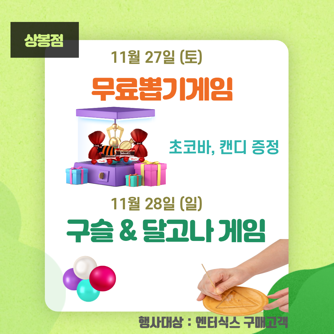 상봉점에서는 11월 27일 토요일에 무료 뽑기 게임을 진행하고 있습니다.