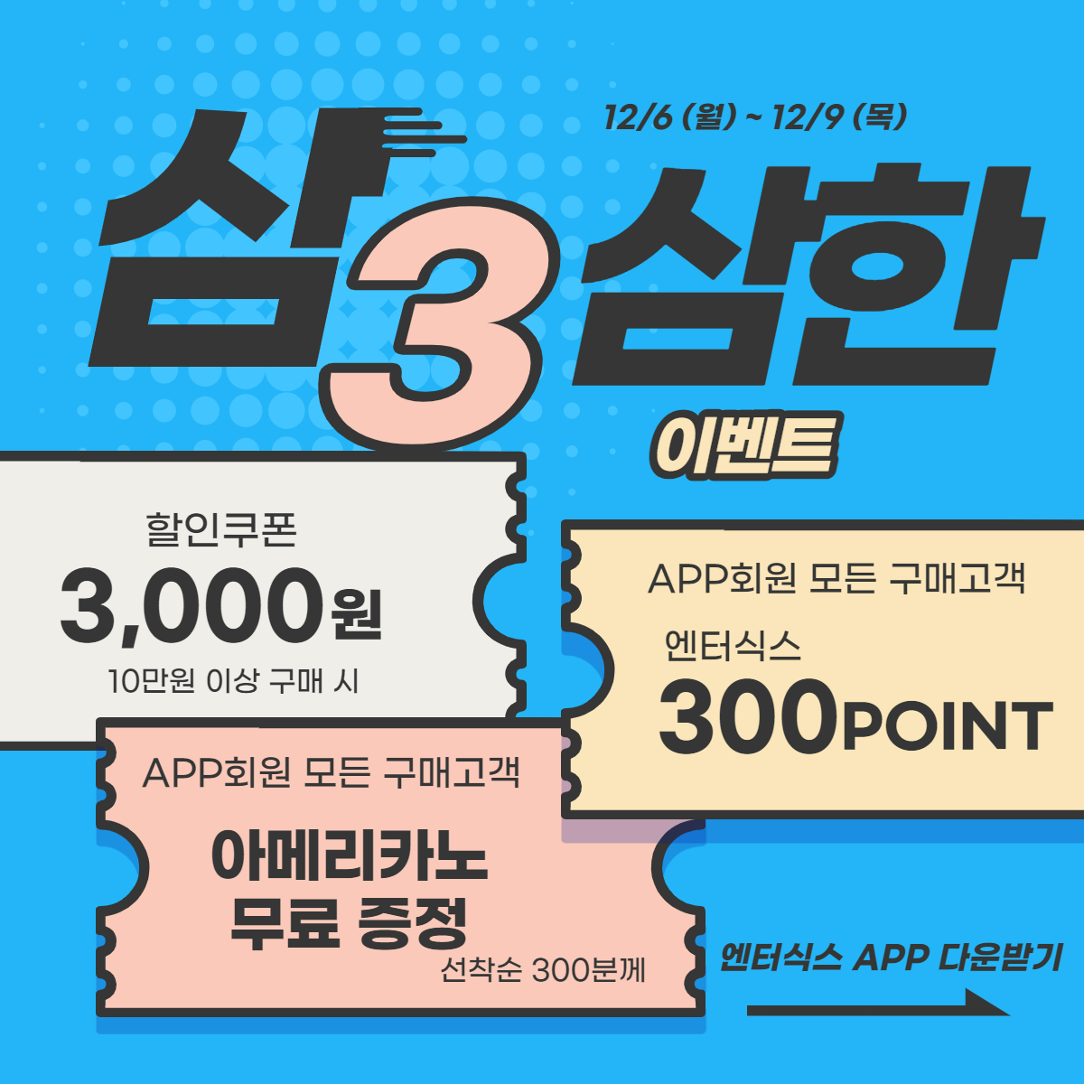엔터식스에서는 12월 6일 월요일 ~ 12월 9일 목요일 까지 삼삼한 이벤트를 진행하고 있습니다.