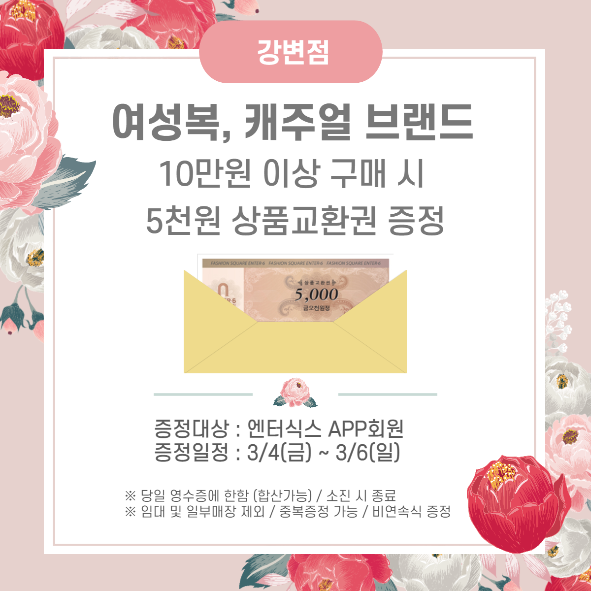 #여성복 #캐주얼 브랜드 에서 10만원 이상 구매 시 5천원 상품교환권을 증정합니다.