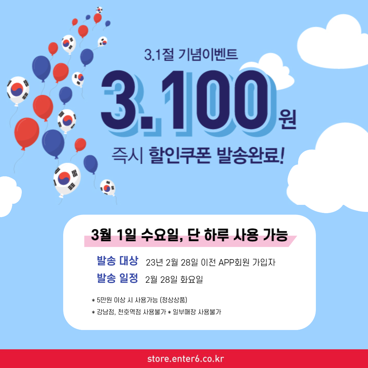 3.1절 기념이벤트 [3,100원 할인 쿠폰 발송]