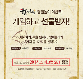 투호 던지기 썸네일형 리스트형 [엔터식스 전점 이벤트]한가위! 명절놀이 이벤트~게임하고 선물받자! 엔터식스 한가위 명절놀이 이벤트!게임하고 선물받자! 제기차기, 투호 던지기, 팽이돌리기 3가지 중 1가지를 선택하여 투호 던지기 - 4개 이상, 제기차기 - 20회 이상, 팽이 돌리기 - 2분이상 성공시킨 고객께 엔터식스 머그컵 SET를 증정해드립니다. ▶행사기간: 9월 22일(토) ~ 23(일), 9월 29일(토) ~ 10월 1일(월), 5일간 더보기 이전 1 다음